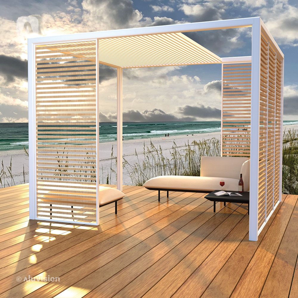 Die Bay Kollektion kann freistehend oder als an eine Hauswand anschließende Pergola eingesetzt werden.